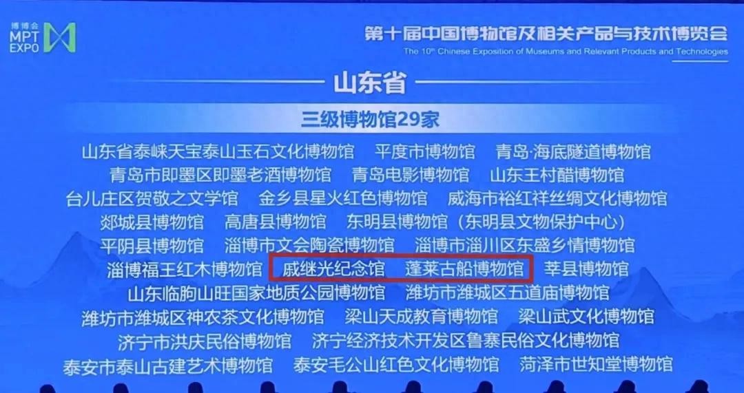 8月23日上午,在第十届中国博物馆及相关产品与技术博览会开幕式上,中国博物馆协会公布了第五批国家二、三级博物馆名单。其中,蓬莱古船博物馆、戚继光纪念馆获评国家三级博物馆。