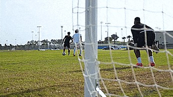 当我们持球到球门附近时,发现有人在门将身后的球门里补防。