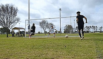 然后把球射向守门员的一侧的近门柱,将球挑过守门员张开的双臂和双腿。