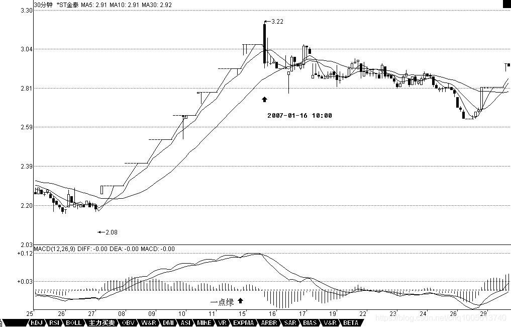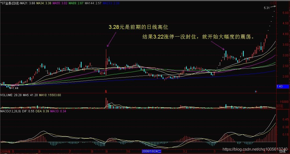 例如600385,在2.92那涨停,MACD出现一点的绿柱子,然后继续涨停,继续红柱子,而3.28元是前期的日线高位,结果3.22涨停一没封住,就开始大幅度的震荡。