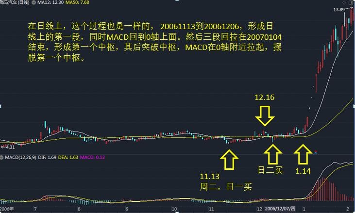 必须注意,MACD在0轴附近盘整以及回抽0轴所形成的中枢,不一定就是相应级别的中枢,而是至少是该级别的中枢。例如日线MACD的0轴盘整与回拉,至少构成日线的中枢,但也可以构成周线的中枢,这时候就意味着日线出现三段走势。