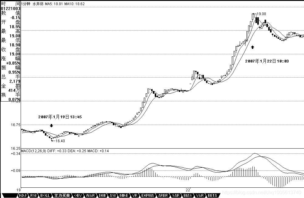打开一个MACD图,首先应该很敏感地去发现该股票MACD伸长的一般高度,在盘整中,一般伸长到某个高度,就一定回去了,而在趋势中,这个高度一定高点,那也是有极限的,一般来说,一旦触及这个乖离的极限,特别是两次或三次上冲该极限,就会引发因为乖离而产生的回调。这种回调因为变动太快,在1分钟上都不能表现其背驰,所以必须用单纯的MACD柱子伸长来判断。注意,这种判断的前提是1分钟的急促上升,其他情况下,必须配合黄白线的走势来用。从该1分钟走势可以看出,17.5元时的柱子高度,是一个标杆,后面上冲时,在18。5与19元分别的两次柱子伸长都不能突破该高度,虽然其形成的面积大于前面的,但这种两次冲击乖离极限而不能突破,就意味着这种强暴的走势,要歇歇了。