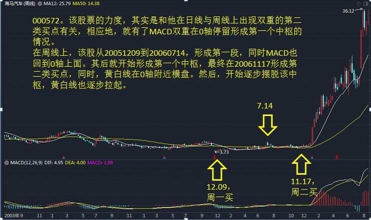 用最近涨得最厉害的一个股票来说明,000572。该股票的力度,其实是和他在日线与周线上出现双重的第二类买点有关,相应地,就有了MACD双重在0轴停留形成第一个中枢的情况。