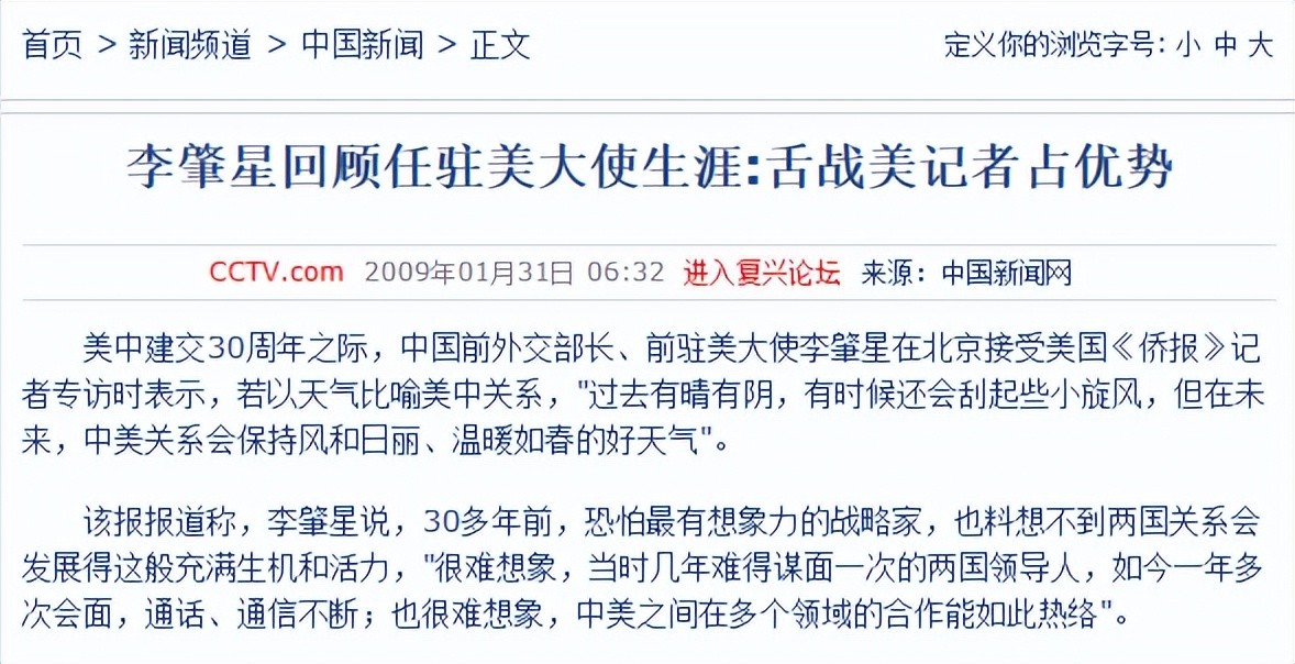 中国新闻网——2009-01-31——《李肇星回顾任驻美大使生涯:舌战美记者占优势》