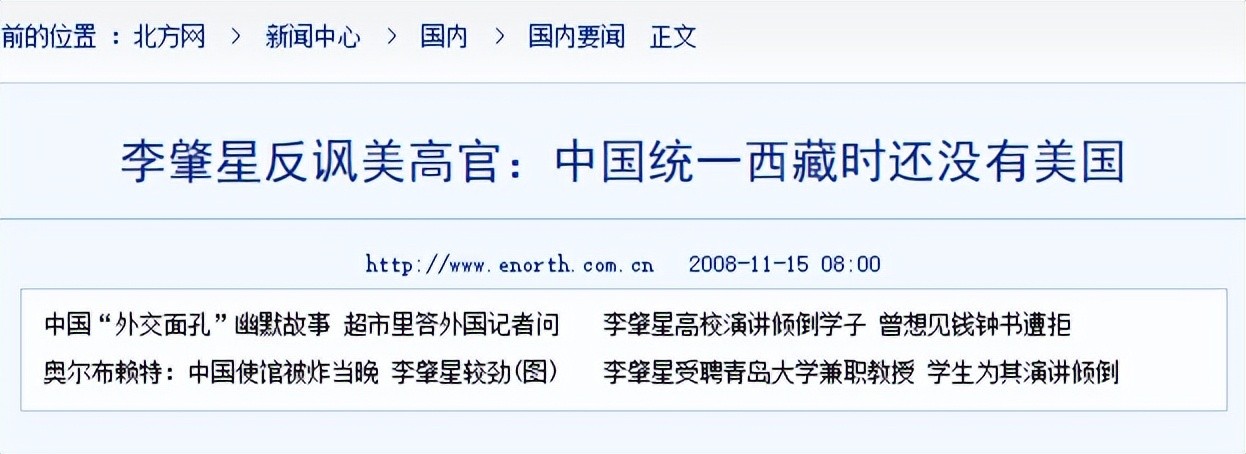 北方网——2008-11-15——《李肇星反讽美高官:中国统一西藏时还没有美国》