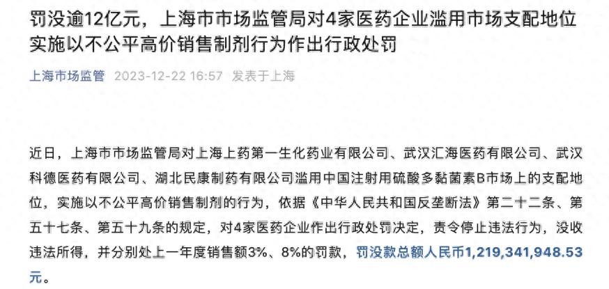 12月22日,上海市市场监管局发布一则通告:“对上海上药第一生化药业有限公司和武汉汇海医药有限公司、武汉科德医药有限公司、湖北民康制药有限公司滥用中国注射用硫酸多黏菌素B市场上的支配地位,实施以不公平高价销售制剂的行为,依据《中华人民共和国反垄断法》,对4家医药企业作出行政处罚决定,责令停止违法行为,没收违法所得,并分别处上一年度销售额3%、8%的罚款,罚没款总额人民币1,219,341,948.53元。”