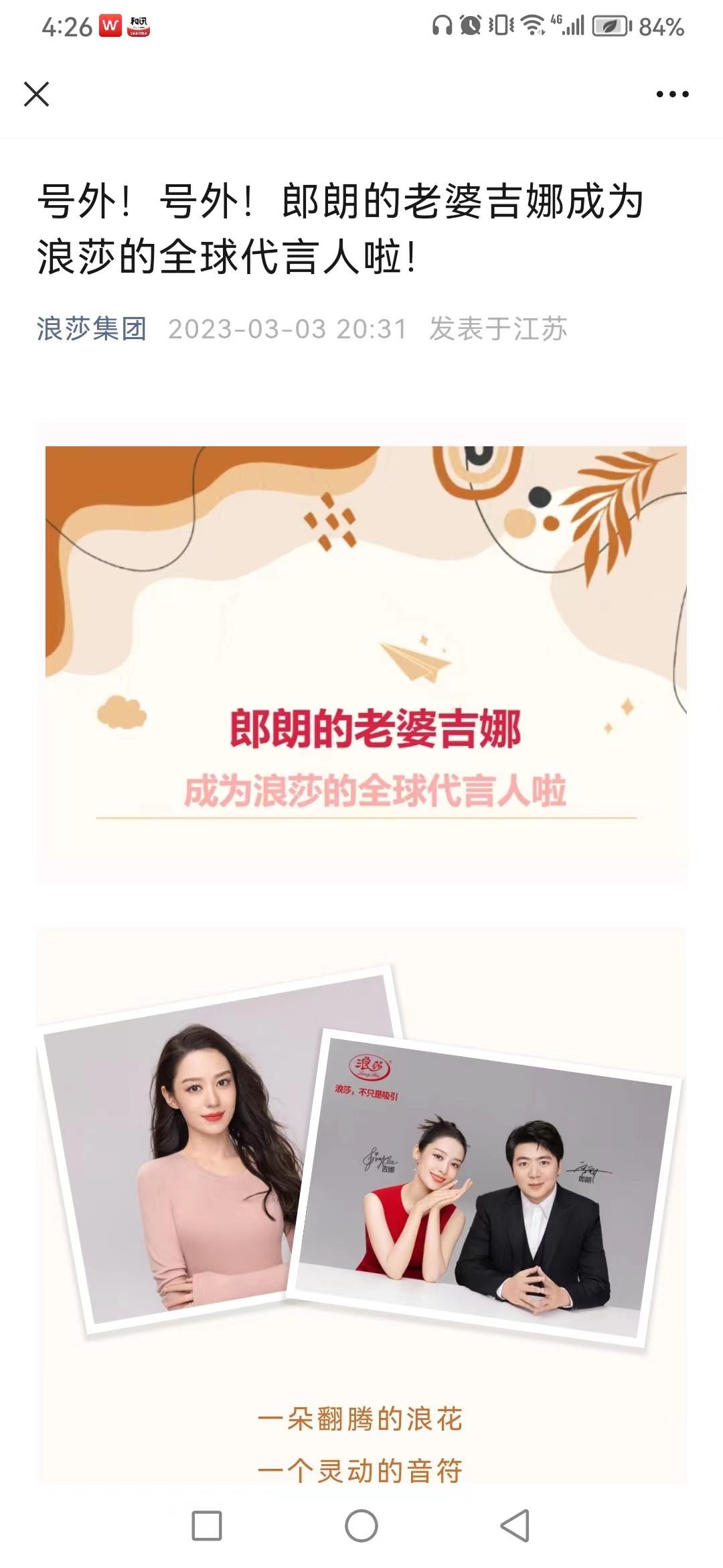 今年1月4日,浪莎股份披露《浪莎股份所属公司签订广告演出及肖像使用形象代言人的提示性公告》,显示,“四川浪莎控股股份有限公司所属全资子公司浙江浪莎内衣有限公司(以下简称‘浪莎内衣’)作为甲方,近日与乙方浙江亿燊文化传媒有限公司及乙方艺人郎朗先生、吉娜(Gina Alice)女士签订了《广告演出及肖像使用合同》,自2023年3月1日起,到2025年2月28日止,公司广告产品包括使用吉娜代言产品、吉娜郎朗代言产品以及郎朗吉娜夫妻共同代言产品,为公司浪莎品牌担任全球品牌代言人。”。
