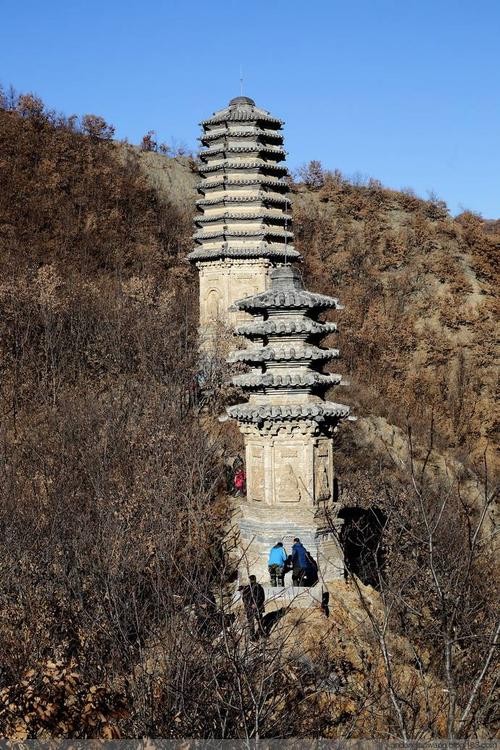 妙峰寺双塔,位于绥中县永安堡乡塔子沟村,建于辽代,两塔相距50米,西塔高24米,东塔高10米,塔身雕刻精细,形态端庄,形象生动,姿态各异。