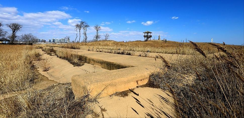 在碣石正对岸海滩之上不到100米的地方,如今还保留一个巨大的秦朝宫殿遗址,中轴线正对着海中的碣石,经专家考古发现,这就是是秦始皇行宫——碣石宫的遗址,秦始皇曾在此建宫驻跸。如今宫殿没了,但巨大的台柱基座还在,保存完整很令人震撼。