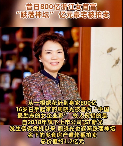 最痛苦的,莫过于白手起家创立了这家公司的“女首富”周晓光,总价值1.2亿的豪宅被拍卖,还有20多亿的债务无力偿还,最终被戴上了“老赖”的帽子。