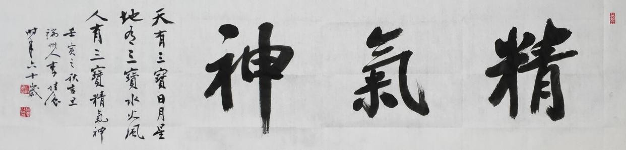 民谚云:天上三宝日月星 ,地上三宝水火风,人之三宝精气神 ,书之三宝气骨韵。书法家们经常写“精气神”三个字来激励自己,也书赠友人,勉励做人一定要精神抖擞,保持到最佳状态。