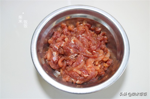 1,猪肉切成丝,用清水抓洗两遍去除腥味。攥干水分后加少许盐、生抽上点底味,多抓一会,抓至肉丝黏手的状态。