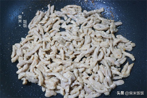 3,热锅倒油,油热倒入腌好的肉丝,大火快速滑炒,将肉丝炒熟盛出备用。这里肉丝一定不要炒时间长了,炒熟立刻出锅,老了口感就差了。