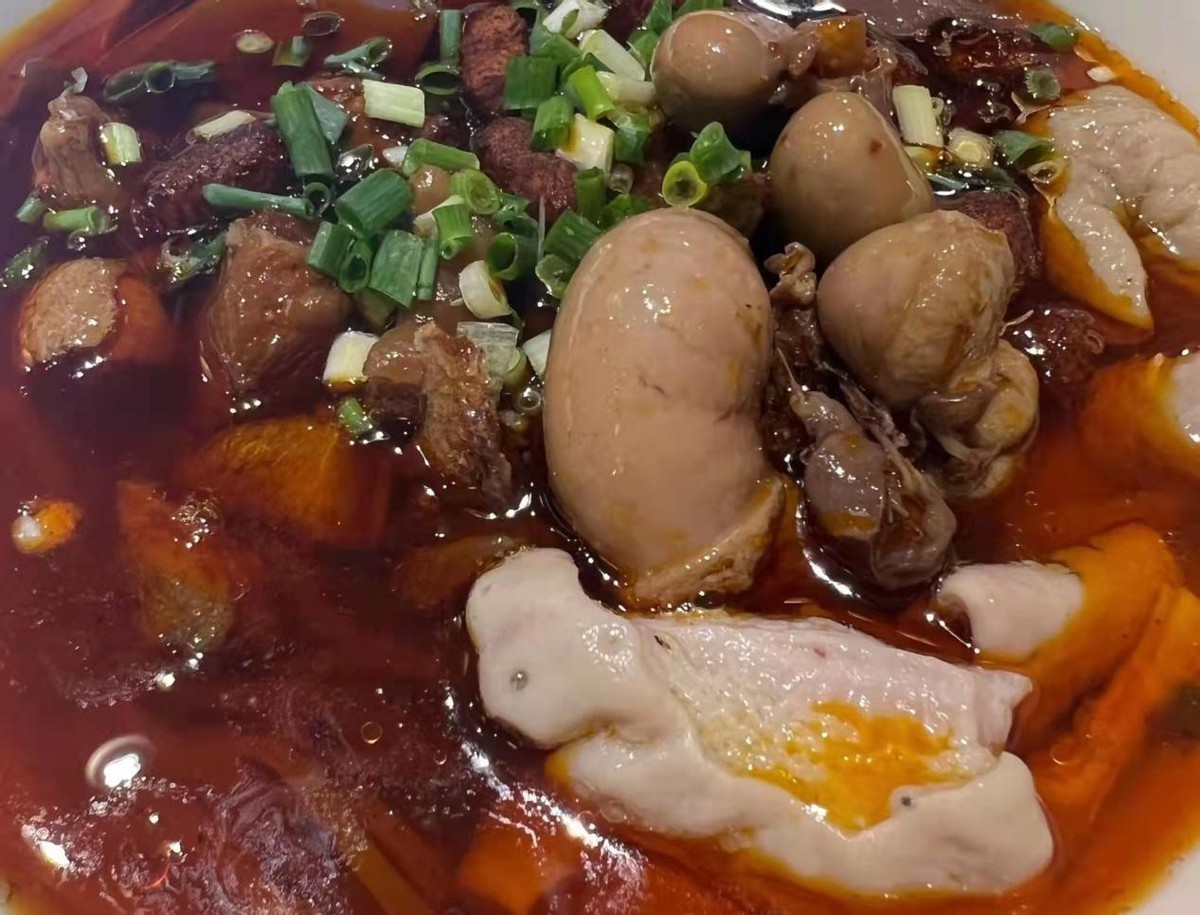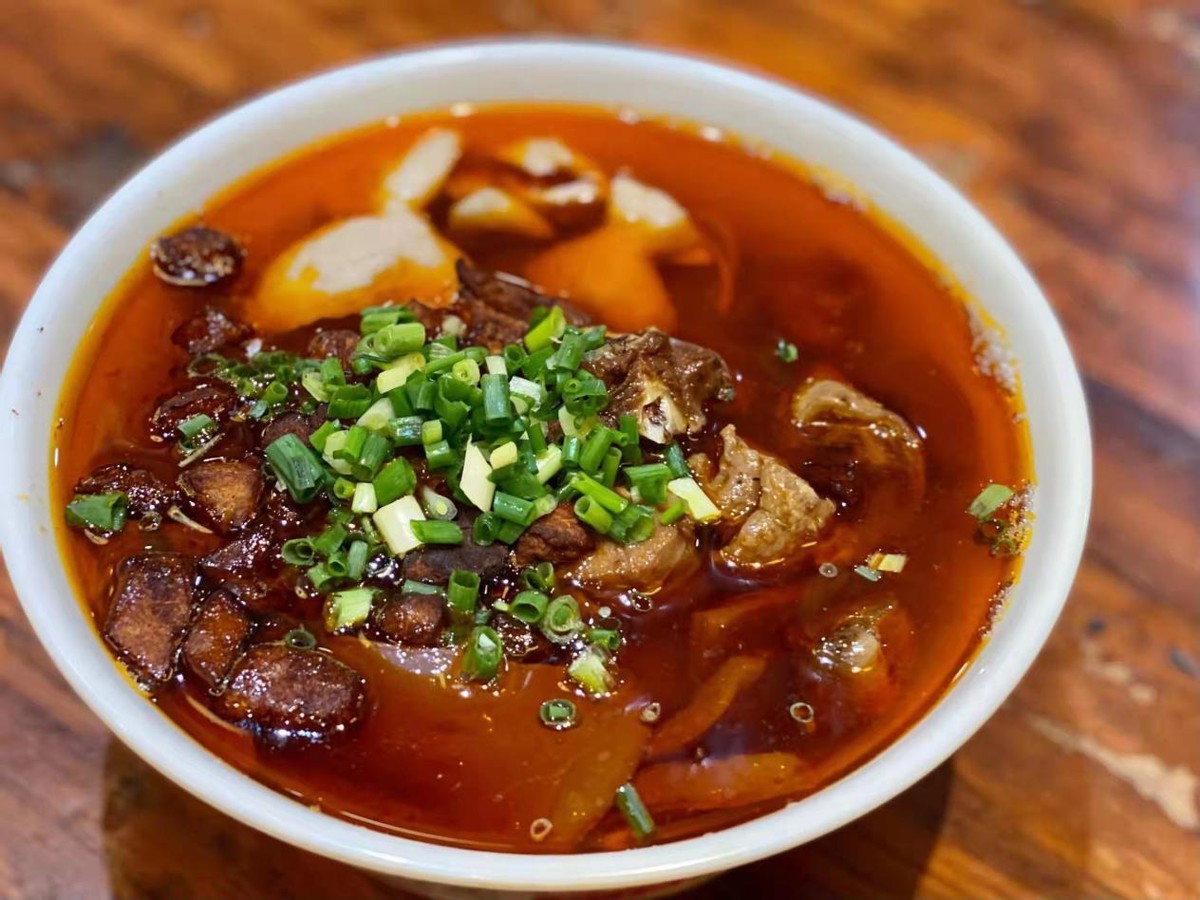血旺是店里新鲜采购,先紧后改刀成薄片,在沸水中穿烫一下吃起来就很鲜嫩,搭配面条口感丰富,层次感也强;肥肠提前烧制好的,随时待命直接放入碗中就可以。