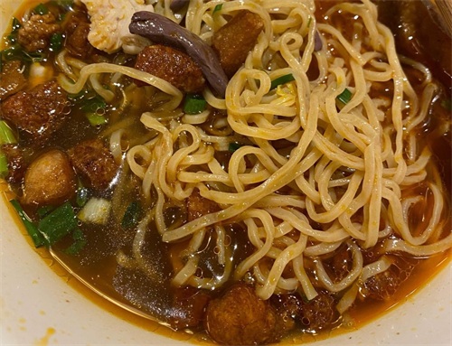 店里的面条颜色好看,看着很有食欲,店里的面条是老板特制的,里面添加了鸡蛋,吃着还能品味出它的香味,面条不用一直在锅中煮制,来客时在沸水中煮上一会沥干就可以出锅,然后浇上血旺、大肠、脆哨再来一勺辣椒油,整个面条得口感就发生了华丽的转身,吃到嘴里面条筋道,有弹性,回味无穷。