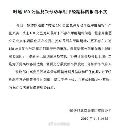 中新网1月14日电 中国铁路北京局集团有限公司今日通过官方微博发布消息称,媒体报道的“时速160公里复兴号动车组甲醛超标”严重失实。
