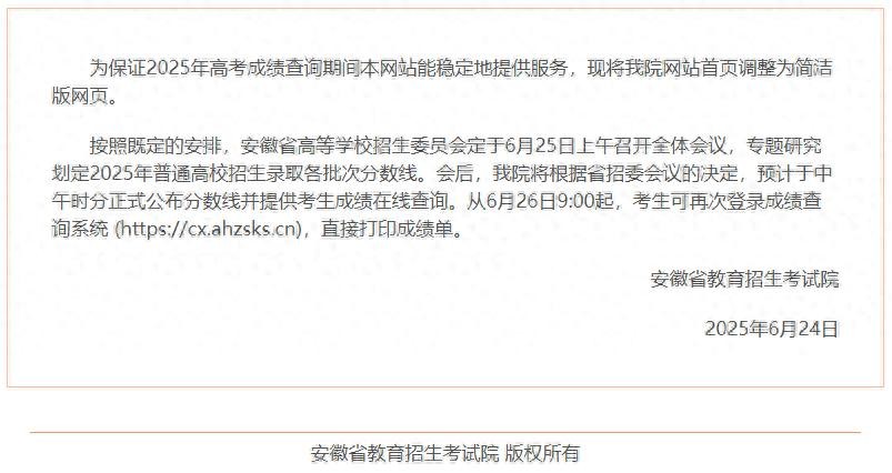 按照既定的安排,安徽省高等学校招生委员会定于6月25日上午召开全体会议,专题研究划定2025年普通高校招生录取各批次分数线。会后,我院将根据省招委会议的决定,预计于中午时分正式公布分数线并提供考生成绩在线查询。从6月26日9:00起,考生可再次登录成绩查询系统 (https://cx.ahzsks.cn),直接打印成绩单。