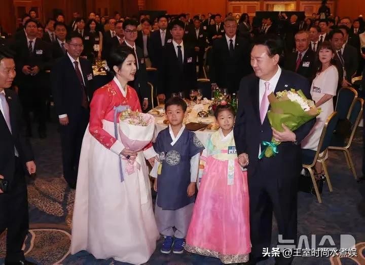 尹锡悦也搭配了一条粉色的领带,与妻子金建希的海棠红韩服相匹配,夫妻俩又一次小心机秀恩爱啦。
