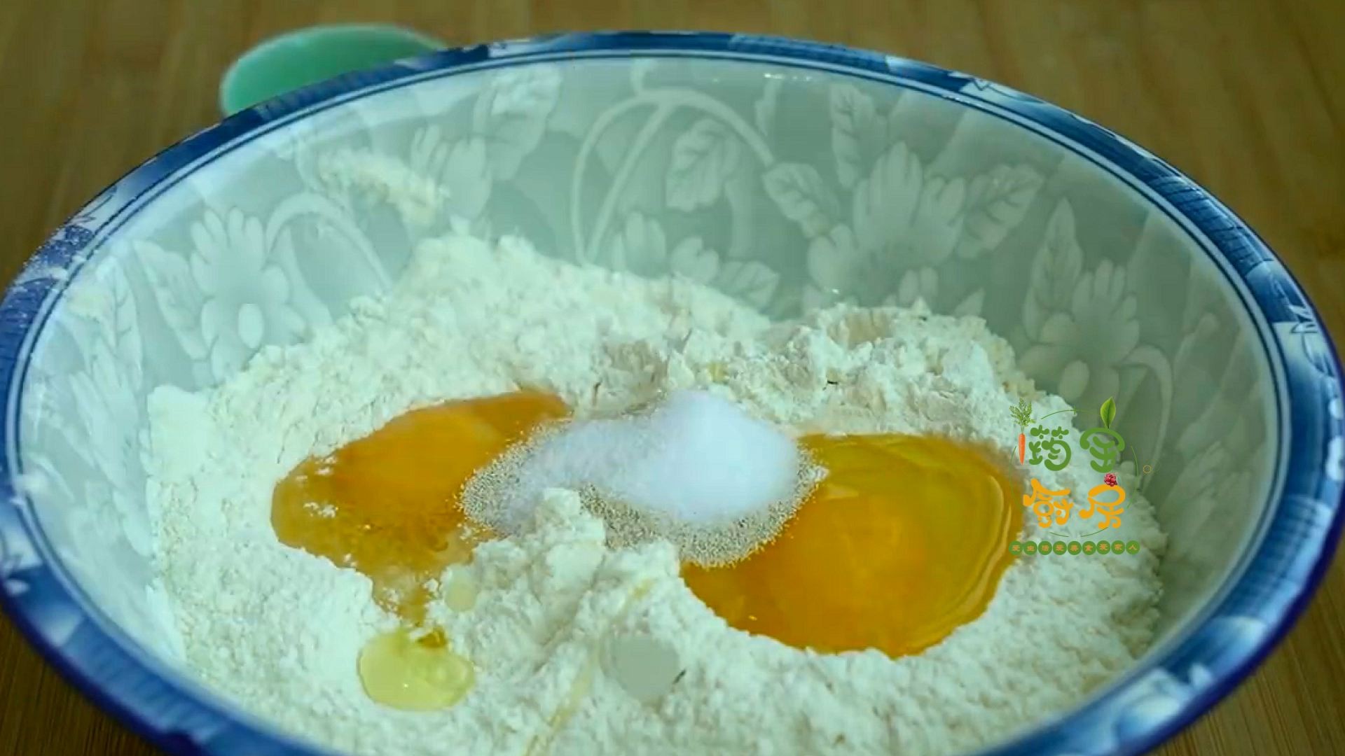 食材:面粉300克、鸡蛋2个、酵母三克、食用盐5克、温水400毫升、小葱三根、五香粉一勺