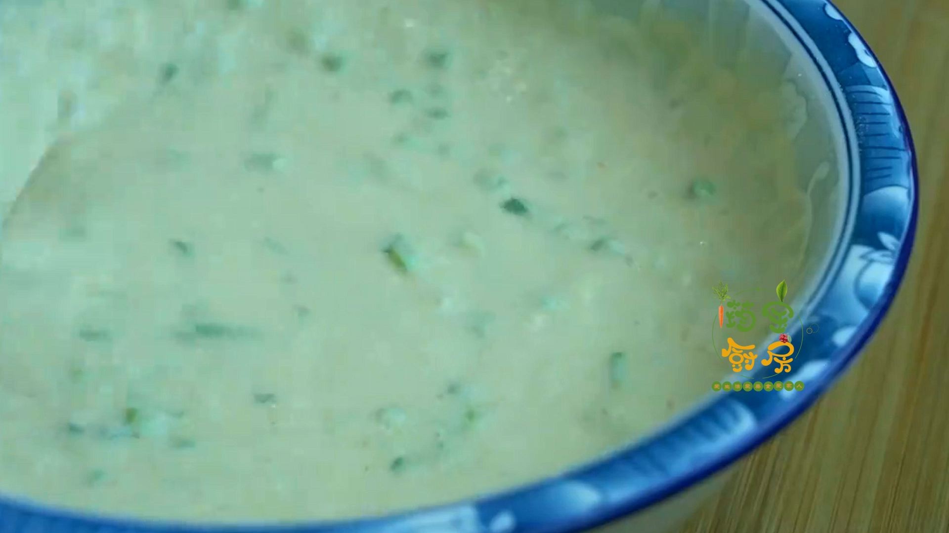第三步:发好的面糊,可以看到表面有许多小气泡,喜欢口味浓点的,可以加入一勺五香粉,然后倒入切好的葱花,朝着一个方向充分的搅拌均匀,让葱花融入到面糊中,同时也可以排出里面的空气,这样烙出的饼吃着才更有嚼劲。