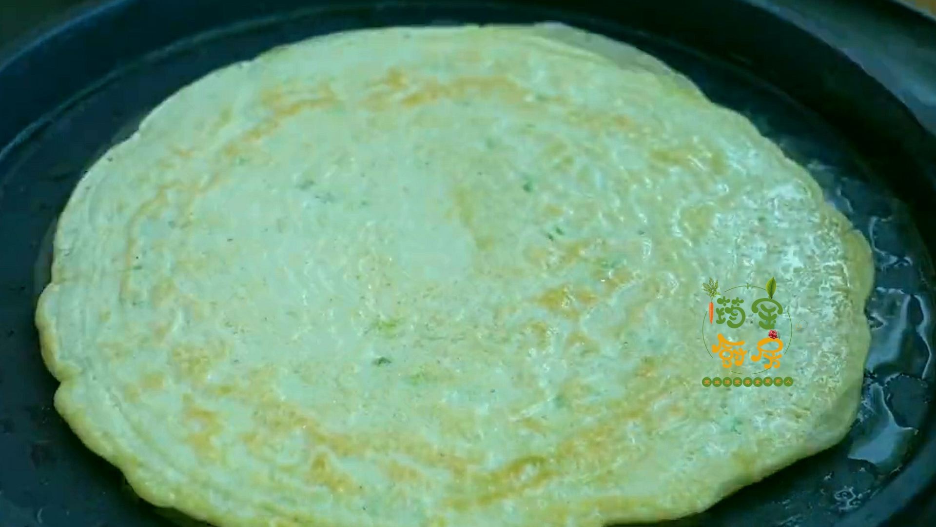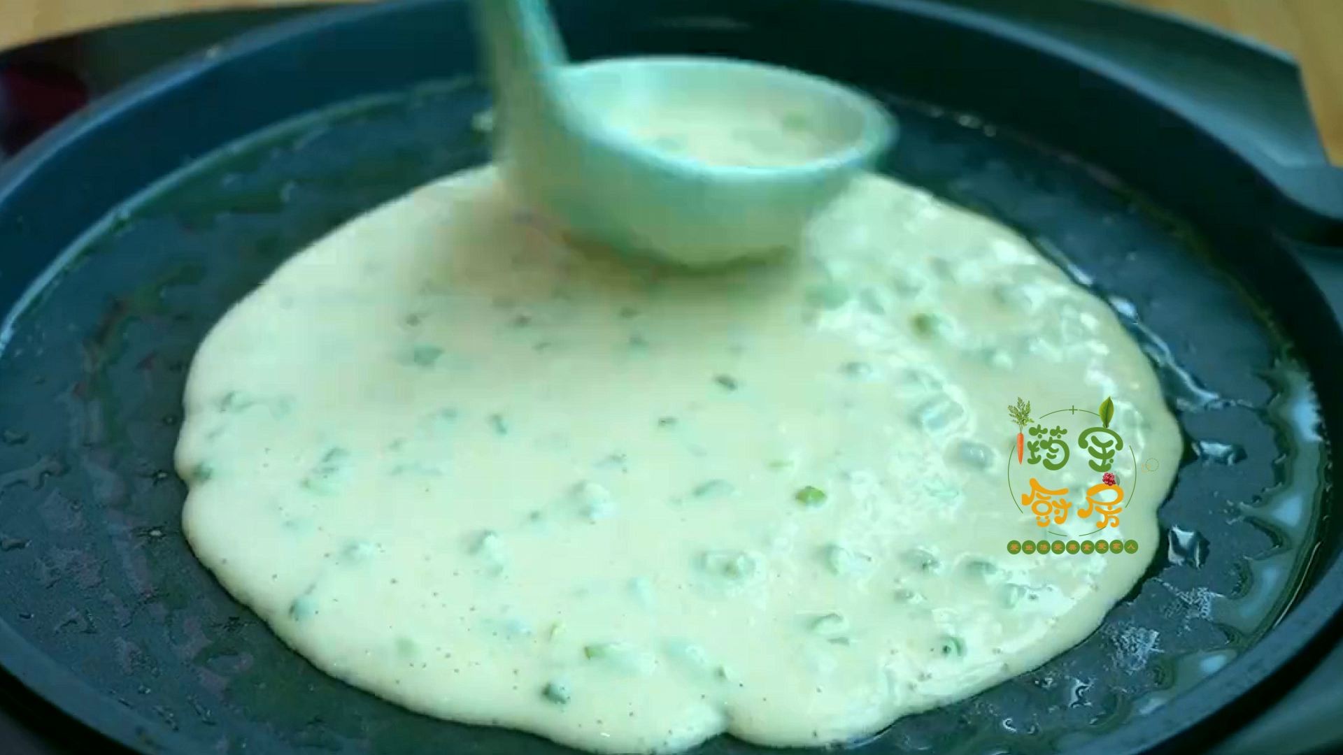 第四步:电饼铛预热,刷一层薄油,开小火倒入两勺面糊,快速的摊开,薄厚尽量摊均匀,然后改成大火格上一分半钟,闻到香味以后,在表面刷上一层油,此时把生胚翻一个面,再烙一分半钟,大火烙饼能尽可能地锁住饼内水分,使水分不流失,同时葱花也能保持更翠绿的颜色,烙制两面金黄就可以出锅了。