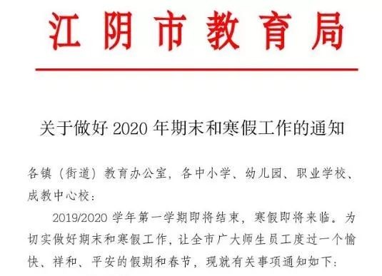 近日,江阴市教育局发布了《关于做好2020年期末和寒假工作的通知》