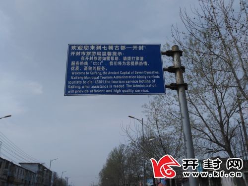 核实:3月26日上午11点,记者来到滨河路东头,在路北侧上方,一块蓝底白字的指示牌出现,上面用中英文书写“欢迎您来到七朝古都——开封!开封市旅游局温馨提示:在开封旅游如需帮助,请拨打旅游服务热线‘12301’,我们将为您提供热情、优质、高效的服务。”