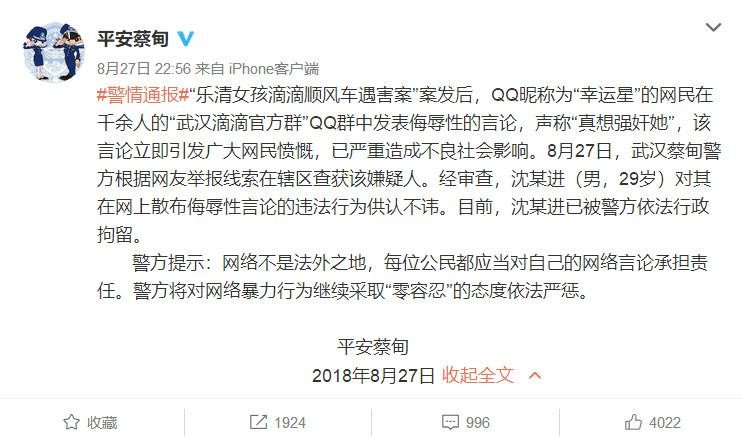 警情通报:“乐清女孩滴滴顺风车遇害案”案发后,QQ昵称为“幸运星”的网民在千余人的“武汉滴滴官方群”QQ群中发表侮辱性的言论,声称“真想强奸她”,该言论立即引发广大网民愤慨,已严重造成不良社会影响。8月27日,湖北武汉蔡甸警方根据网友举报线索在辖区查获该嫌疑人。经审查,沈某进(男,29岁)对其在网上散布侮辱性言论的违法行为供认不讳。目前,沈某进已被警方依法行政拘留。
