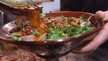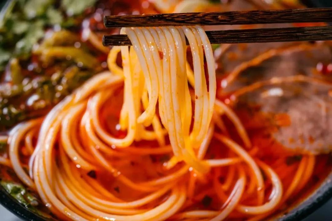 嗦一筷子粉,油辣子的香辣、酸菜的酸爽、山羊肉的丰腴伴随着浓郁的汤汁,细细咀嚼心满意足,再来一口原汁原味的羊肉汤,不油不腻,辣椒的香气融入其中,鲜香有度~