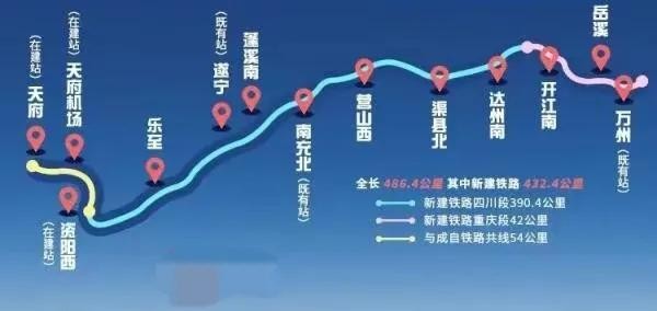 全线共设十三个站分别是:岳溪、开江南、达州南、渠县北、营山西、蓬溪南、乐至、万州北、遂宁、南充北、资阳西、天府机场、天府。(部分站现有、还有部分站在建)