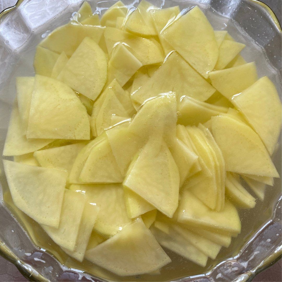 制作2:土豆片过凉水,去除淀粉,开水煮下断生即可