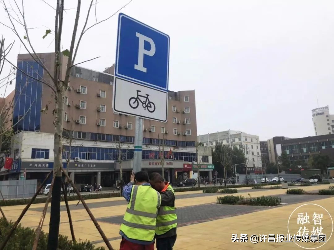 (市政实业集团有限公司施工人员正在安装指示牌)