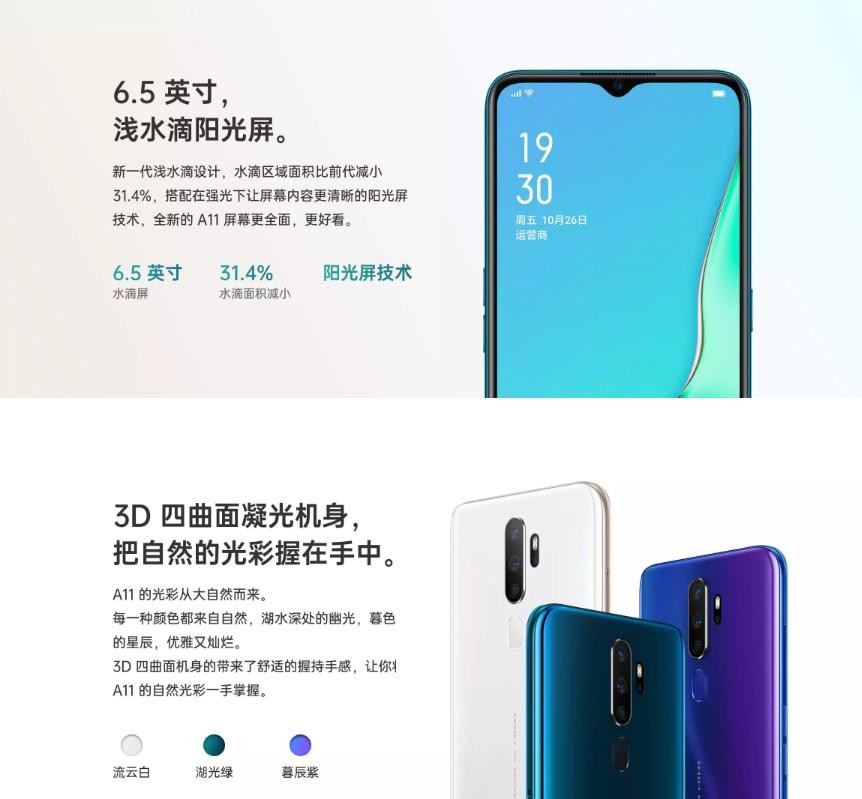 今天,OPPO 悄然在官网上线了一款 A 系列新机 OPPO A11。说起 A 系列,虽然该系列在 OPPO 中的热度不如 Reno 系列一样火爆,但凭借着年轻的设计和超值的价格,一直吸引着很多的用户。像上一代的 OPPO A9 就凭借随着 1600 万双摄和 4020 mAh 电池让很多小伙伴心动不已,而这次更新,看来又将给用户带来新的惊喜。