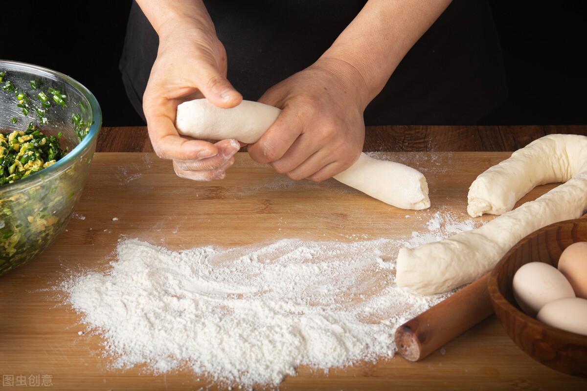 6、取适量的面粉和清水搅成絮状,揉成光滑的面团,盖上一层笼布,醒发静置10分钟,再次把面团揉成长条,切成小一点的剂子。