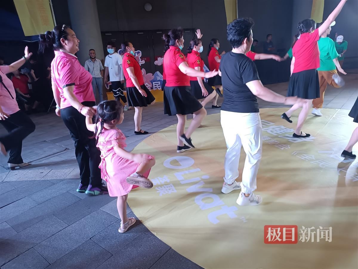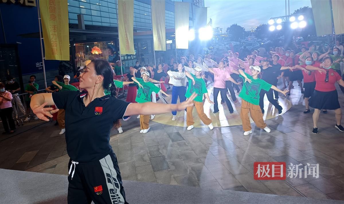 8月7日晚,2022年湖北省“全民健身日”主题活动暨2022年湖北省广场健身舞公益大课堂(武汉站)在竹叶海商圈上演。湖北省健身舞协会的6支舞团带来风格各异的广场舞,吸引了不少路人围观。