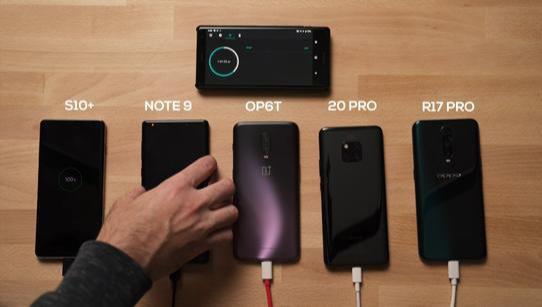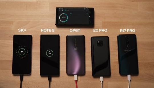 一同测试的手机有:三星S10+(4100mAh)、三星note 9(4000mAh)、一加6T(3700mAh)、华为mate20 Pro(4200mAh)和OPPO R17 Pro(3700mAh)。