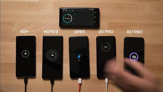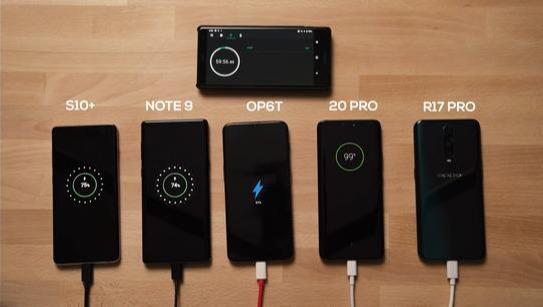 充电30分钟后5款手机电量分别为:三星S10+(40%),三星note 9(39%),一加6T(54%),华为mate20 Pro(66%),OPPO R17 Pro(94%)。