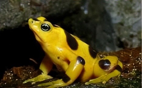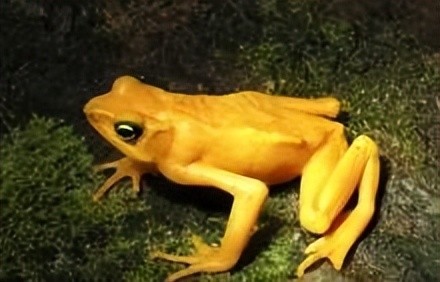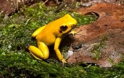 黄金箭毒蛙主要生活在美洲一带的热带雨林中,它和我们平日见到的青蛙不同。它浑身上下除了一对眼睛是黑色之外,其余部位都是金黄色分布。