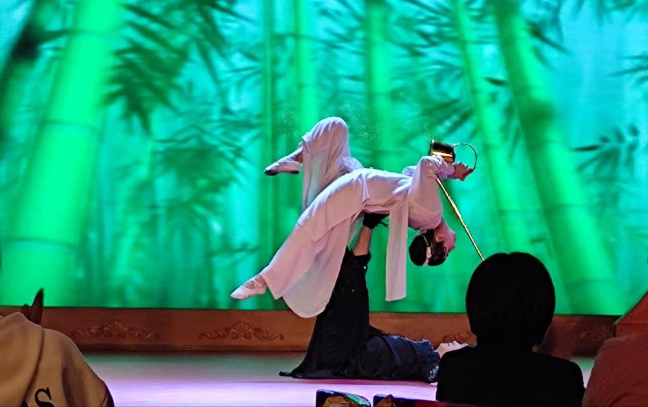 让我很震撼的一个是茶壶艺术表演,首先是后边的背景做得太美了,平日里我就很喜欢国风类的画面,这个表演每个场景都做得精美绝伦,宛若仙境,演员们也都是神采俊秀。