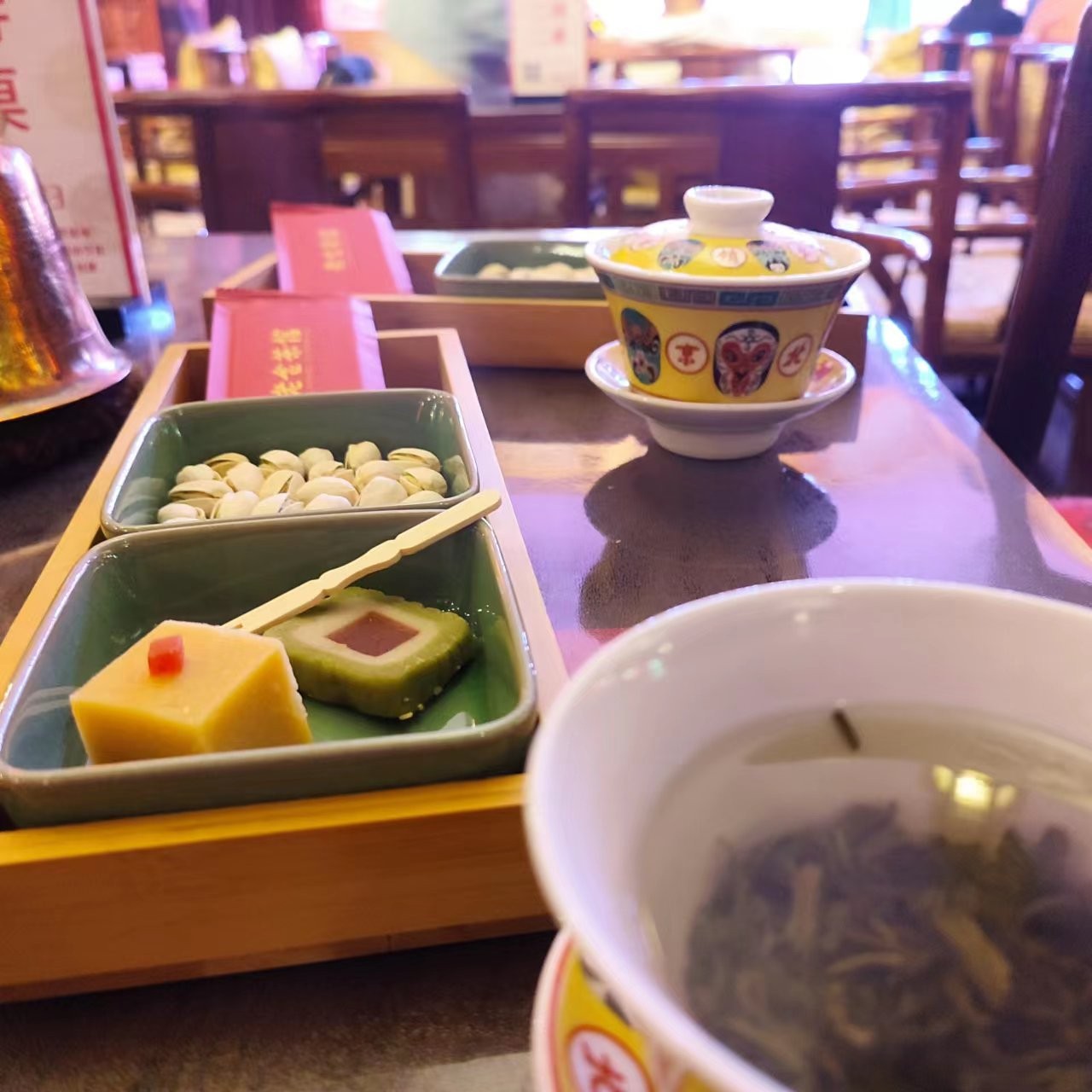 三楼是表演的地方,座椅非常舒适大气,我们落座之后,马上有服务员小姐姐端上了茶水和点心,中间感觉茶水快喝光时,马上会有人来添水,这一点特别贴心,每个服务的小哥哥和小姐姐脸上都是笑意盈盈,让人如沐春风。
