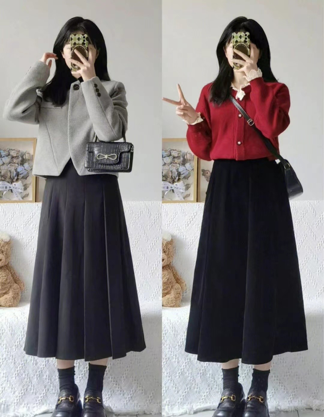 上衣是短款的毛衣外套,很温暖,搭配长款的高腰百褶裙,穿出韩系般的甜美感觉,小个子女生这样搭配婉约大气,有一种大家闺秀的既视感。