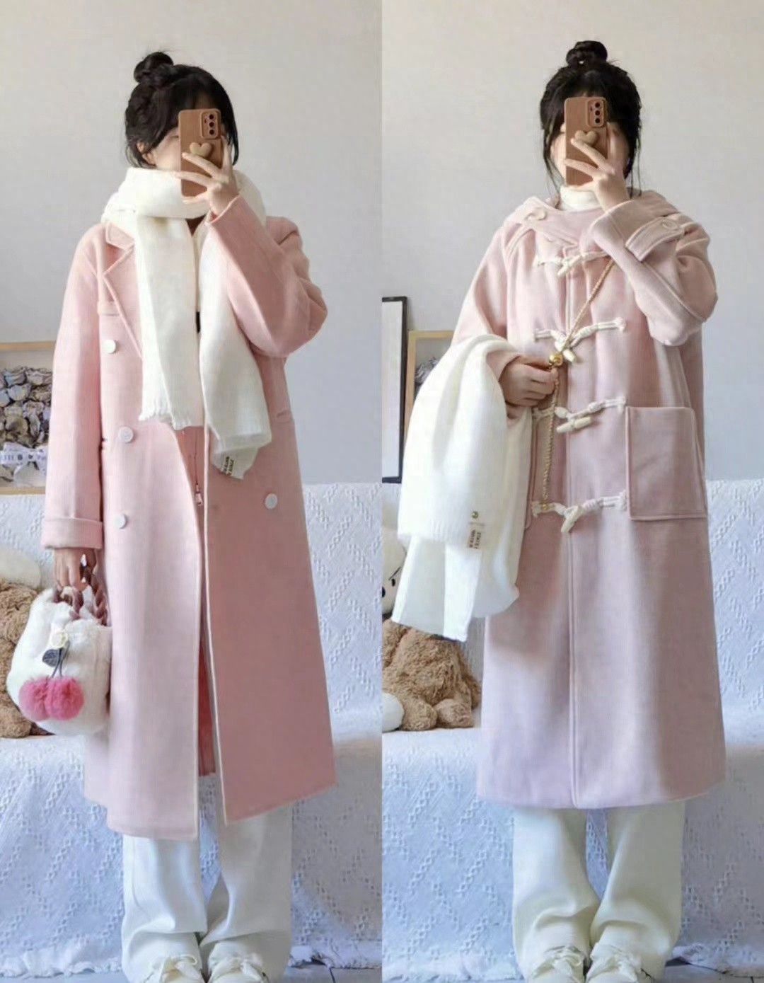 桃粉色的牛角扣大衣小个子女生穿在身上唯美而又可爱,简约优雅,而且粉色是非常衬肤色的色彩,在秋冬季节搭配很有氛围感。
