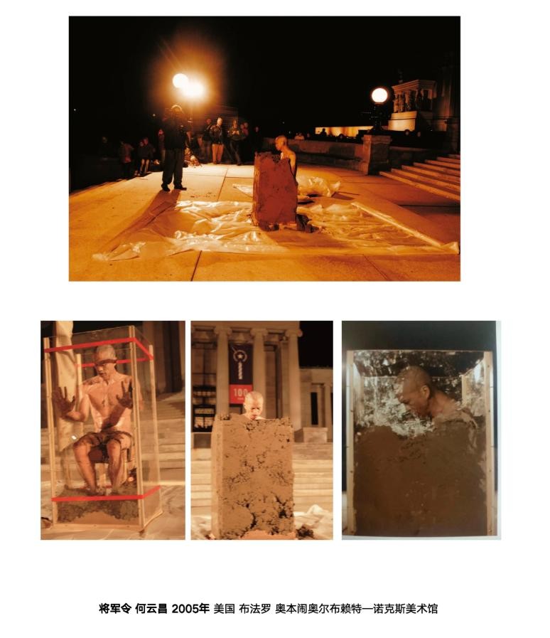 何云昌为云南籍艺术家,因作品的语言穿透力和社会性批判,成为亚洲最具代表性的行为艺术家。何云昌有一系列以水泥和身体为媒介的行为艺术作品,2003年10月24日至25日,何云昌实施行为艺术作品《抱柱之信》,内容为将自己的手臂浇筑到水泥柱子中保持24小时,其典故来源《庄子》的尾生抱柱故事。2004年何云昌在北京798艺术中心展览中实施作品《铸》,将自己身体封闭在水泥做的黑屋子中24小时,仅保留屋顶一个小出气口,直到工人帮他破墙而出。2005年10月实施的行为艺术作品《将军令》内容为将水泥浇筑至他的胸口并持续一小时直到水泥固化。