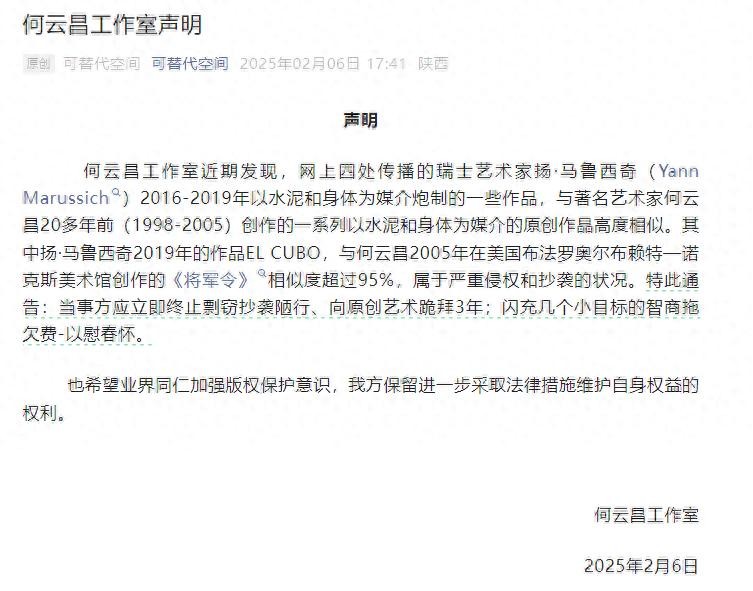 2月6日傍晚,国内著名行为艺术家何云昌工作室通过微信公众号发布中英双语声明,称工作室近期发现网上四处传播的瑞士艺术家扬·马鲁西奇(Yann Marussich)2016-2019年以水泥和身体为媒介炮制的一些作品,与何云昌20多年前(1998-2005)创作的一系列以水泥和身体为媒介的原创作品高度相似。其中扬·马鲁西奇2019年的作品EL CUBO(《立方体》)与何云昌2005年在美国布法罗奥尔布赖特—诺克斯美术馆创作的《将军令》相似度超过95%,属于严重侵权和抄袭的状况。“特此通知当事方立即停止剽窃抄袭陋行,向原创艺术跪拜3年;闪充几个小目标的智商拖欠费以慰春怀。”