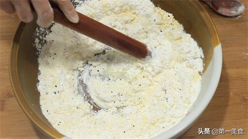 1.首先,我们准备面粉200克,玉米面100克,再撒入一小把熟的黑芝麻,放入白糖10克促进发酵,酵母3克,用常温水和面就可以,边倒边搅拌。