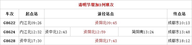 记者了解到,此次增加的3列高铁运营时间为4月2日至4日,4日后3列高铁将不再经过资阳。其中,车次G8622早上9点26从内江北出发,9点45分到达资阳,10点13分抵达成都东站;车次G8624于中12点32分从内江北出发,12点59分到达资阳北站,下午1点48分抵达成都东;车次G8628于下午5点30分从资中北出发,5点43分到达资阳北,下午6点12分抵达成都东站。