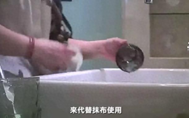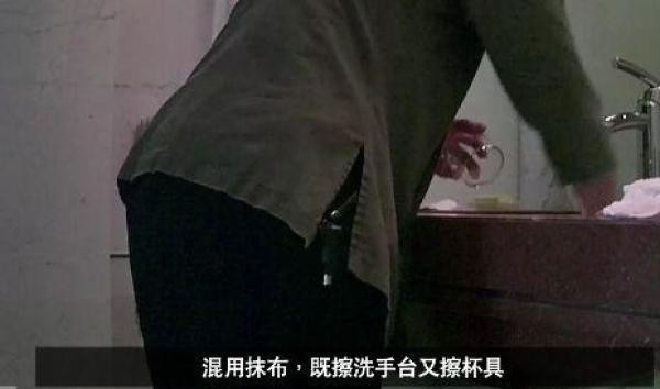 在视频中可以看到,使用同一块脏抹布,或脏浴巾、脏海绵擦拭杯子、洗手台、镜面的现象在14家酒店中普遍存在。