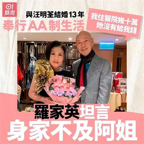 罗家英直言不讳,表示他和汪明荃奉行AA制生活,“我住院花几十万,也没有用她的钱,自己身家不如阿姐,但不会贪她的钱,我们两个人赚的钱会分开。”