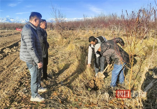 2023年12月5日,湖北省三湖农场的技术人员在新疆维吾尔自治区伊犁哈萨克斯坦自治州第四师可克达拉市六十一团试种三湖黄桃幼苗(通讯员庄涛供图)