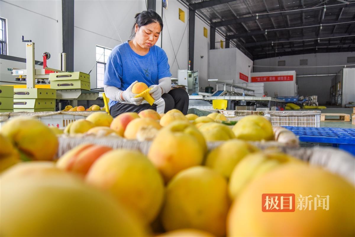 在湖北省丰之喜农业生态发展有限公司的车间,分拣员正在分拣三湖黄桃(极目新闻记者 黄志刚 摄)